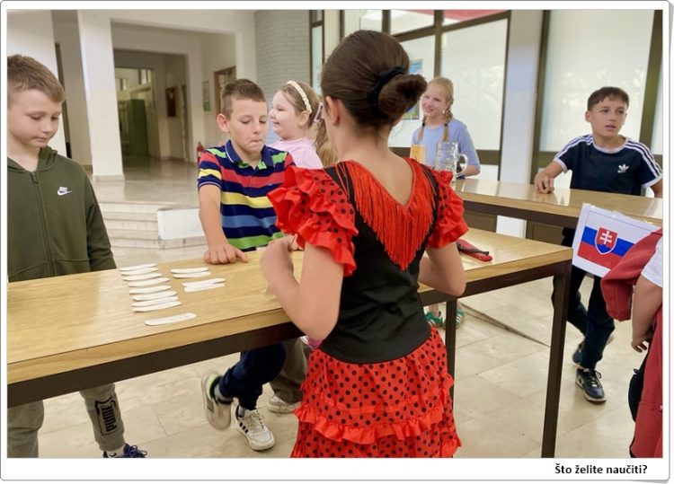 U slavu jezične različitosti EU-a, Europski dan jezika obilježava se 26. rujna. Ove godine u našoj školi mali su projekt o jezičnoj različitosti odradili učenici petih razreda koji idu na Dramsku skupinu njemačkog jezika, koju vodi učiteljica Tatjana Mioković. Oni su sami odabrali zemlju i jezik, odnosno riječi koje će naučiti druge učenike. Kod kuće su se samostalno pripremili, radili male štandove, plakate i učili izgovarati riječi na stranim jezicima.